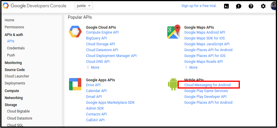 - After that click on services of the left panel and turn on Google Cloud Messaging for Android.